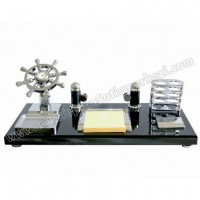 Bu masa seti ahşap gövde üzeri kalemlik, notluk, kartvizitlik, ataçlık, saat aksesuar ve kullanım alanlarına sahiptir. |
